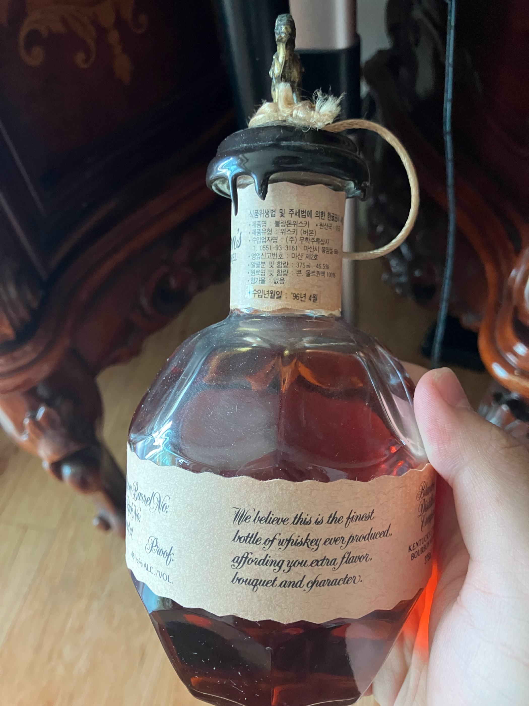할머니 집에서 쌔벼온(?) 블랑톤위스키 입니다. 사진에 자세히 보면 수입년월일이 96년 4월 이라고 나와있는데, 1996년에 만들어진 것 일까요??