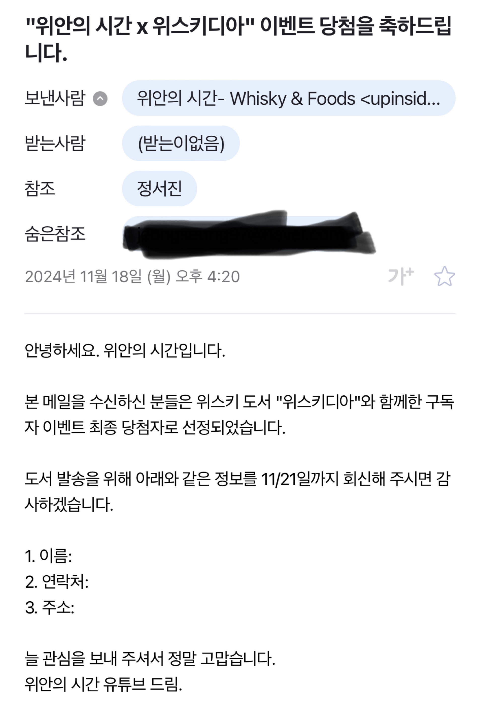 김지호 기자님께서 발간하신 위스키디아! 이벤트로 응모한 책이 당첨됐네요! 앞으로 더 많은 지식과 위스키 손민수를 할 수 있게 되어 기쁩니다 ㅎㅎ 감사한 마음으로 읽도록 하겠습니다🥃