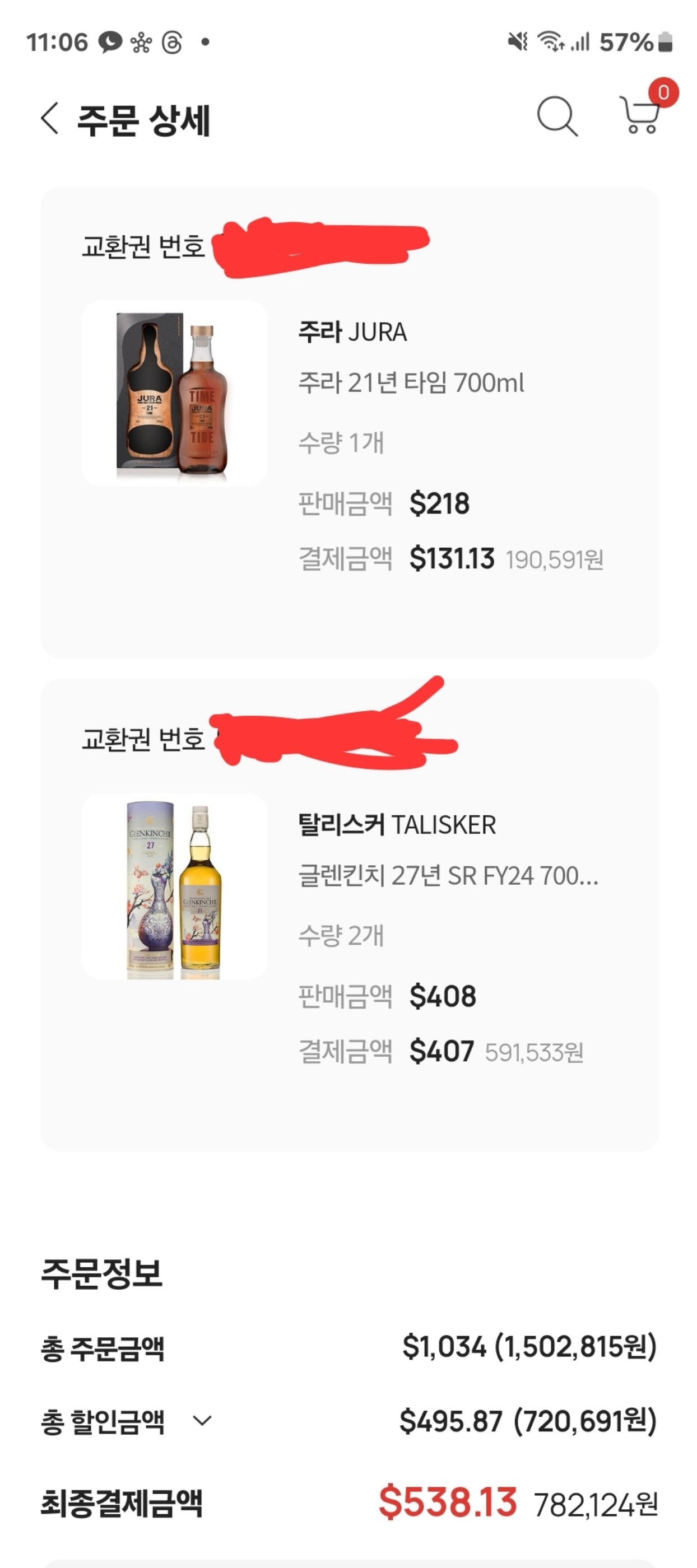 3월에 나트랑으로 가족여행이 급작스럽게 잡혀서 인터넷 면세로 쇼핑했습니다. 글렌킨치 27년 SR 2병이랑 591,533₩ 주라 21년 타임 1병 190,591₩ 이렇게해서 총 782,124₩ 나왔네요.. 거기에 6만원 삼성카드 결제일할인 3.2만원 네이버 포인트 적립예정 69만원쯤에 세병 구입했습니다. 이정도면 나름 선방한것 같은데 맞나요? ㅎㅎㅎ