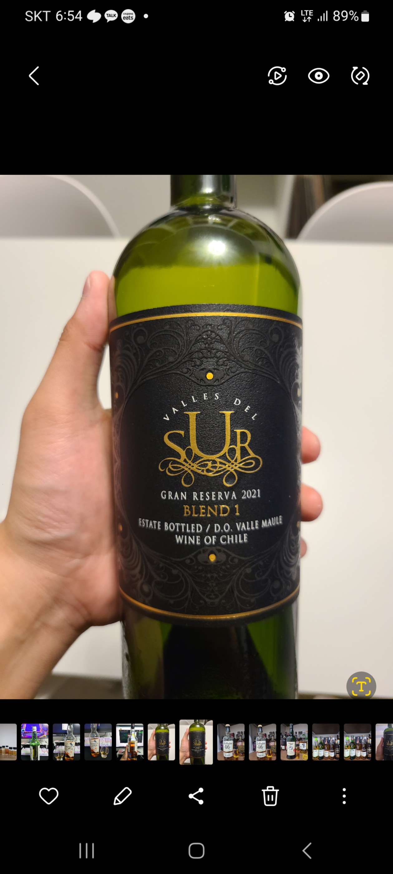 Valles del Sur, Gran Reserva Blend 1 2021 와인킹 팝업 다녀오면서 구매해 온 와인 색 : 옅은 루비 와인에 대한 견문이 짧아 자세한 노트에 대해서는 모릅니다... 진짜 선명하게 느껴지는 베리와 블랜커런트의 향이다. 처음에는 가죽스러운 향과 초콜릿이 느껴졌다. 시간이 지날수록 베리류의 향이 한츰 강해지고 선명해진다. 맛에서 가장 매력적인 부분은 오키한 맛이었다. 위스키에서 날 것 같은 오크의 맛이 와인에서 났다. 블랙커런트, 베리, 체리류의 맛은 여전히 느껴진다. 바디감 자체도 아주 강한 것은 아니지만 어느정도 가지고 있다. 탄닌감 자체도 부드럽게 넘어간다. 단점으로는 꽤 묽다고 느껴지는 맛이었다. 첫 잔은 정말 맛있게 마셨지만 마시면 마실 수록 물을 탄 것 같은 밍밍함이 함께 느껴졌다. 비릿한 느낌보다는 정말 묽은 맛. 잔에 물기가 있는지 확인도 했다. 피니쉬 자체도 탄닌에 오키함으로 깔끔하면서 길다. 이날 와인을 꽤 많이 마셨는데, 가격이랑 첫 인상은 가장 좋았다. 재구매의사는 60% 정도? 가격이 1.7만이었나 다시 먹을만 하긴한데, 와인을 자주먹는 입장이 아니다 보니 더 좋은 와인 찾을 것 같다. 하지만 가격이 깡패이므로 고민인 와인이다.