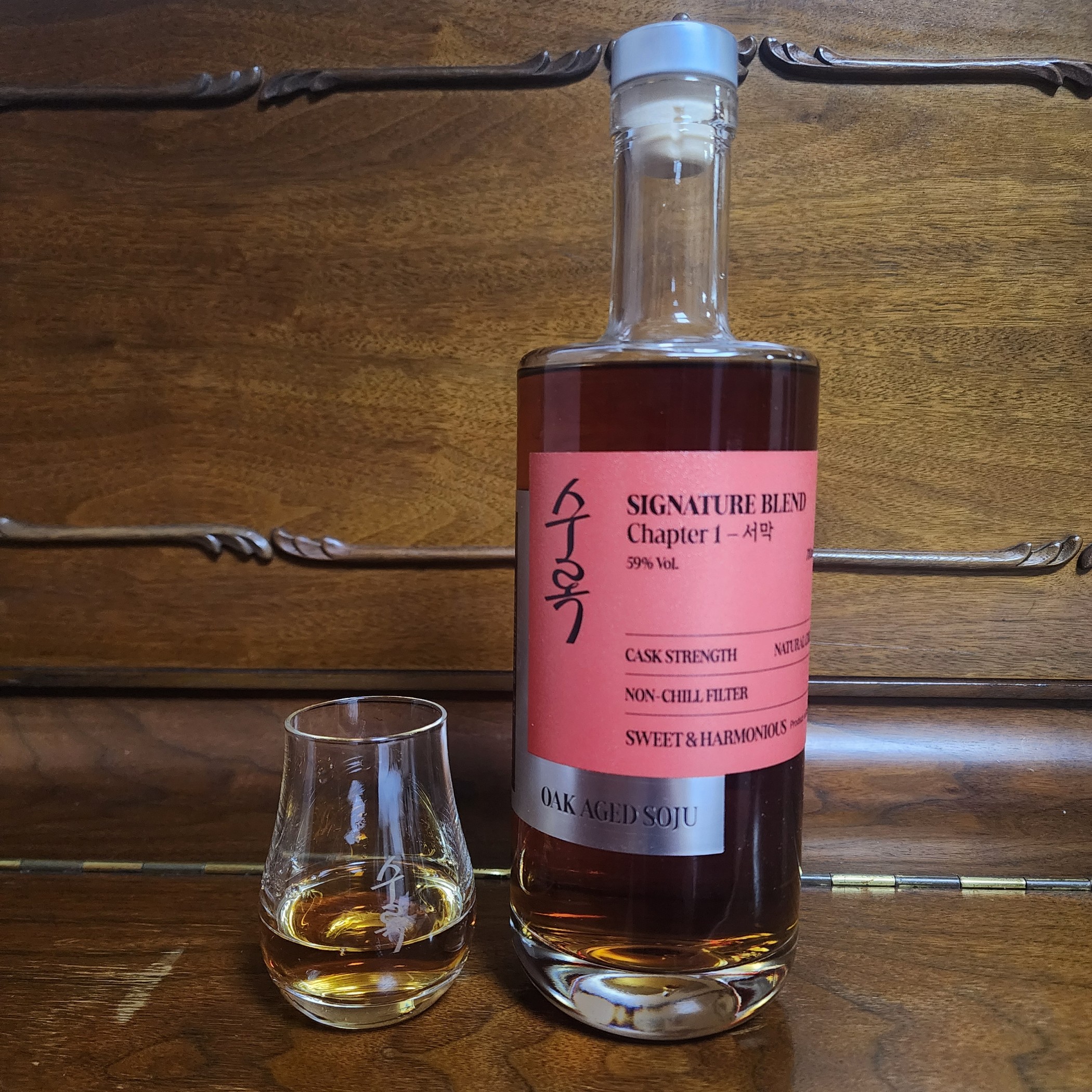 59도에 바로 뚜따했음에도 불구하고 알콜이 그렇게 치지 않습니다 초콜릿 향을 중심으로 아주 잘 익은 과일과 약간의 꽃, 꿀, 바닐라, 향신료 향이 납니다 제가 지금까지 경험한 오크 숙성 소주 중에서는 가장 풍성하고 복합적인 향이 나는 것 같습니다 맛에서는 마치 PX 셰리 위스키 같은 찐한 단맛이 먼저 들어오고 향신료, 복숭아 같은 과일의 맛이 이어지며 목넘김은 도수가 도수라 그런지 살짝 거친 편입니다 여운은 포도, 오크, 흑설탕, 꽃 같은 향이 먼저 느껴지고 그 이후에 수박 먹고 난 뒤의 느낌(?) 같은게 이어지는데, 시간이 좀더 지나고 나서 먹어보니 여운에 곡물 같은 고소한 향이 단 향과 어우러져서 아주 좋게 느껴집니다 같은 가격대의 다른 술들과 비교했을 때 원탑이다! 느낌은 아니어도 충분히 최상위권에 놓일 수 있는 술이라고 생각합니다
