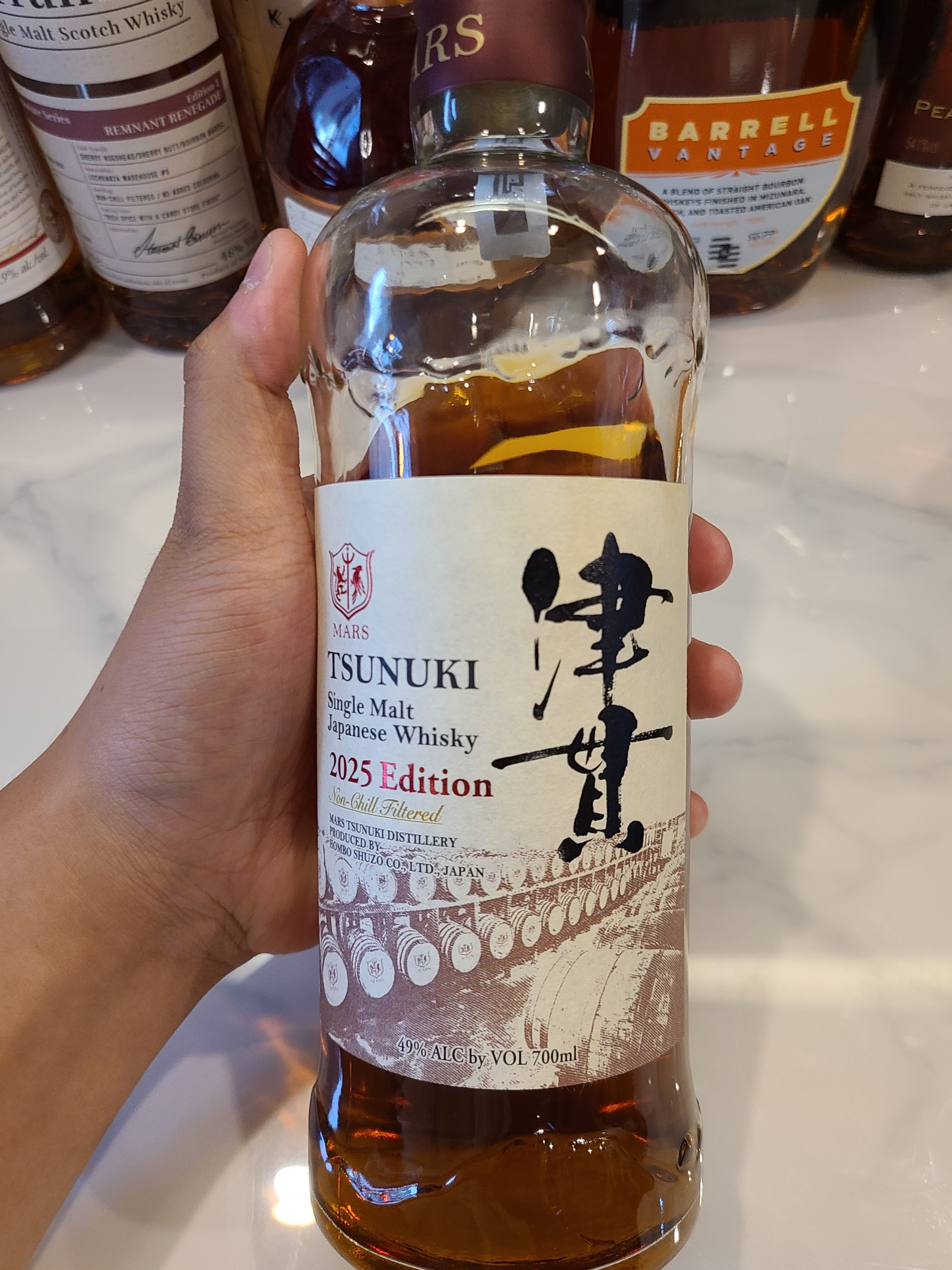 종류 : 재패니즈 위스키 도수 : 49% N - 건포도, 푸룬, 핵과류, 꽃, 시트러스, 오크, 피트 꿉꿉한 느낌의 셰리가 먼저 느껴진다. 건포도, 푸룬의 느낌이 강하게 들면서 핵과류의 단내도 있다. 일본 위스키 특유의 약간의 화사함과 오키함. 그리고 약간의 산미? 그나마 사과에 가깝기는 한데 정확히 잡기에는 어렵다. 이쯤부터 피트가 연하게 느껴지기 시작했다. (츠누키 피트 없다고 먹인 바틀 주인, 반성하세요!) 스모키한 피트감이다. 특별하게 뾰족한 느낌도 적고 잘 만든 오각형이다. 츠누키 2024보다는 호불호 덜 갈리게 만든 것 같다. P - 꿀, 건포도, 금귤, 설탕, 오크, 몰트, 후추 꿀과 건포도를 함께 마신 것 같다. 단 맛 뒤에 바로 시트러스함과 바닐라가 따라와서 임팩트가 강하지는 않다. 향에서는 시트러스가 애매했는데 맛에서는 조금 더 강조된다. 금귤처럼 과육과 껍질을 같이 씹는 듯한 맛에 설탕도 함께하는 맛. 그리고 오크의 쓴 맛이 살짝 튄다. 처음에는 셰리캐가 강하구나 생각했는데, 중간을 넘어갈 수록 버번캐가 더 강하게 느껴진다. 고소한 몰트감에 후추의 스파이시. 매운 느낌이 거의 느껴지지 않아서 신기했다. F - 피트, 몰트, 후추, 젖은 나무 재패니즈 자체를 별로 안 좋아하기도 해서 그렇게 취향에 맞는 술은 아니였다. 남이 줄때는 맛있지만 내 슬롯 사용하기는 싫은 위스키.