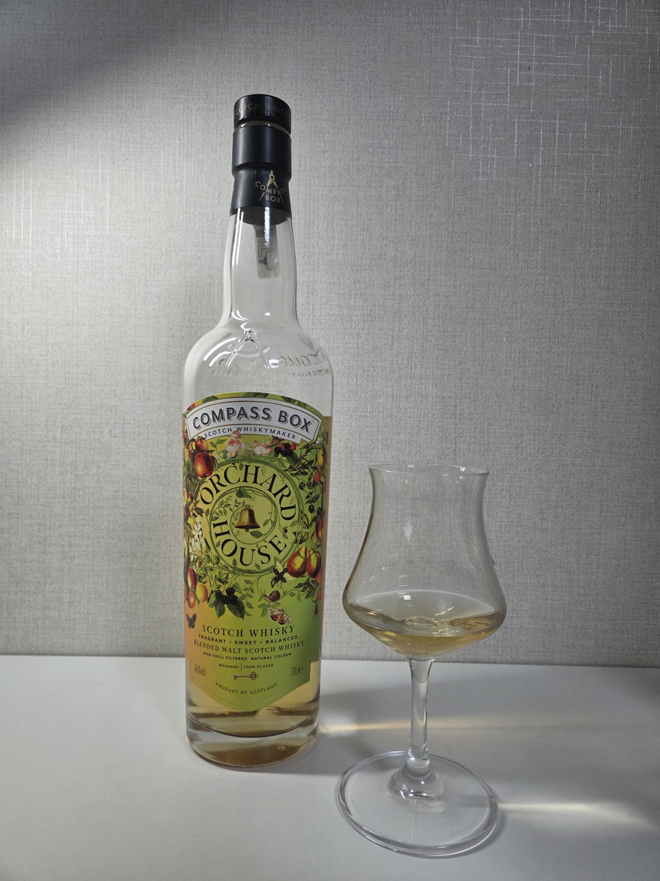 컴파스박스 오차드 하우스 46% 700ml Nose 청사과와 청포도의 향이 느껴진 후 바로 아세톤의 향기가 따라온다. 그 후 바닐라가 슬쩍 끼어들고 곧이어 이탄의 향이 옅게 난다 Palate 고작 3% 들어간 주제에 피티함이 강렬히 치고 올라오고 뒤이어 달콤한 사과즙과 서양 배의 맛이 입을 채운다. 오크의 스파이시와 약간의 훈연 뉘양스가 꼬리에 옅은 바닐라를 달고 온다. Finish 스모키함이 달콤한 과즙과 함께 짧게 여운을 남긴다. 컴파스박스의 베스트 셀러 오차드 하우스. 과수원이라는 이름답게 과일이 메인으로 입에서 과즙이팡팡 터지지만 아주 조금 들어간 피트가 존재감이 너무 강해 피트를 좋아하지 않는다면 브리딩이 필수이다. 가격 생각하면 그란트 15의 대체제로 고민해봄직 하다