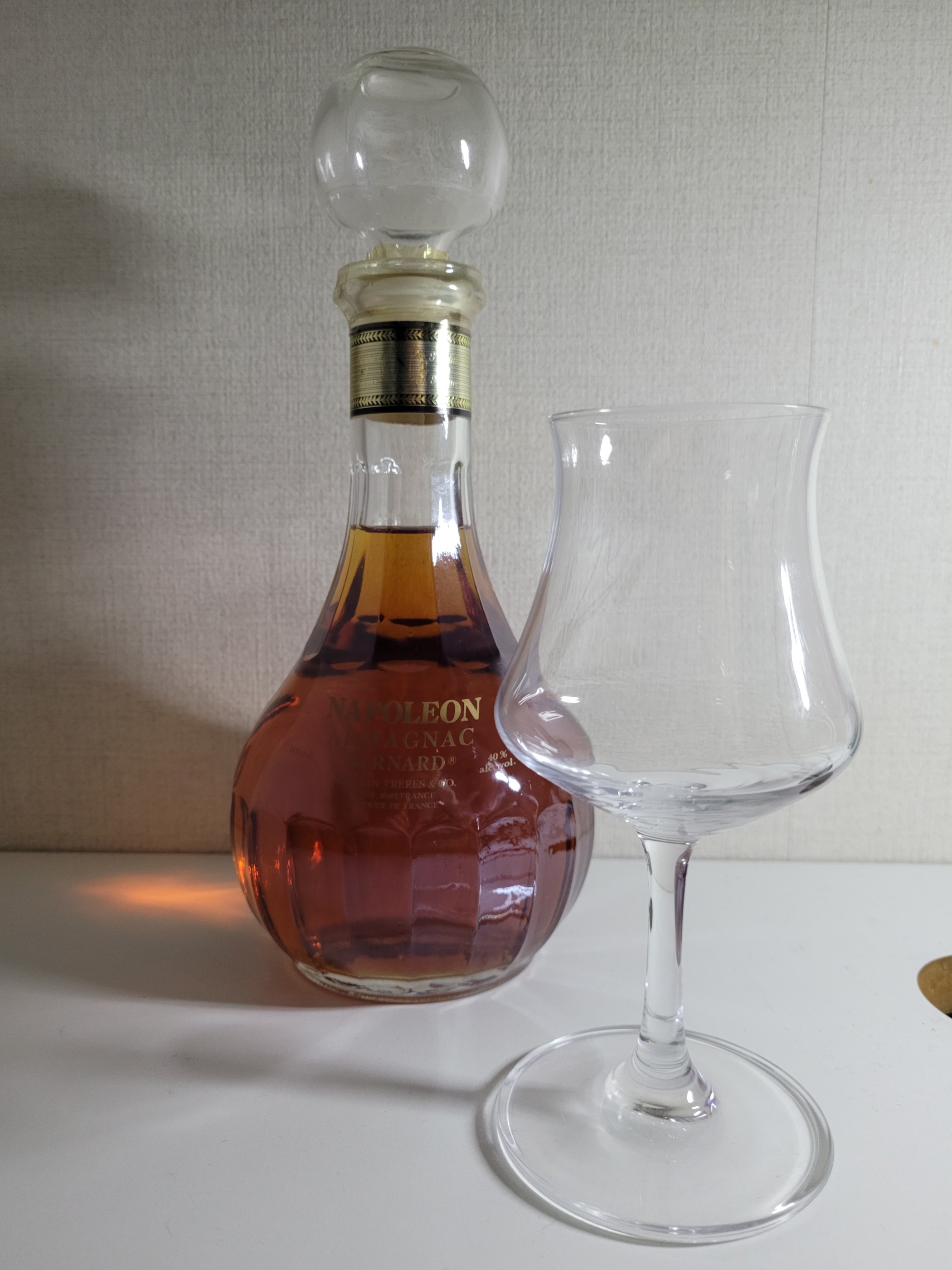 BERNARD NAPOLEON 40% 500ml 약 10~18년 숙성한 아르마냑 Nose 알코올의 부즈가 치고 올라온 후 청포도 계열의 싱그러운 과일향이 뒤이어 온다. 그 후 찐득한 포도잼의 향이 나고 미약한 시트러스와 미약한 초콜릿이 마지막으로 느껴진다. Palate 물같은 질감과 바디감이 느껴진다. 계피의 느낌이 상당히 강하게 느껴진 후 건자두와 포도 껍질 맛이 입을 채운다. 조금의 탄닌감이 난 후 다크초콜릿 맛이 점점 강하게 느껴진다 Finish 후추와 계피의 향과 맛이 길게 입안에 머무르고 카러멜의 느낌이 살짝 난다. 일옥에서 나폴급 아르마냑이 싸길래 궁굼해서 주웠는데 딱 가격정도의 퍼포먼스이다. 근데 코르크가 고무이고 병이 이뻐서 만족