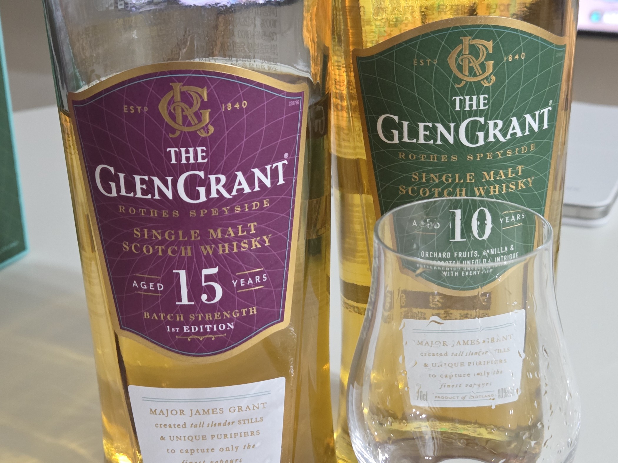 향: 전형적인 버번캐, 약한 유산취와 달큰한 과일향, 신선한 풀내음, 입으로 들이쉬면 가볍게 달달한 느낌만 있고 다른 향은 없음, 사과껍질 같은 상큼함 맛: 살짝 오일리한 질감, 스파이시, 상큼, 골드메달 사과주스가 생각나고 독자적 특징은 못느낌 피니쉬: 고소함, 달달알싸한 꿀향, 전체적인 피니쉬는 짧음 ✔️가볍고 섬세한, 나무맛이 빠진 글렌그란트 15 [아래는 글렌그란트 시리즈와 비교시음] - 그란트10이 잘익은 사과향(수박바 초록부분맛)이 압도적으로 많이 남, 맛은 살짝 밍밍하나 당도는 비슷하거나 그란트 10이 좀 더 높음. - 그란트15는 사과향은 생각보다 약함. 직관적인 상큼함은 적으나 튀거나 거슬리는 부분이 없음. 좀 더 달큰한 황설탕물향. 아주 달다. 도수는 높지만 많이 스파이시하지는 않고 꽉 찬듯한 맛. 오히려 향보다 맛에서 새콤달콤 과일맛이 느껴짐.