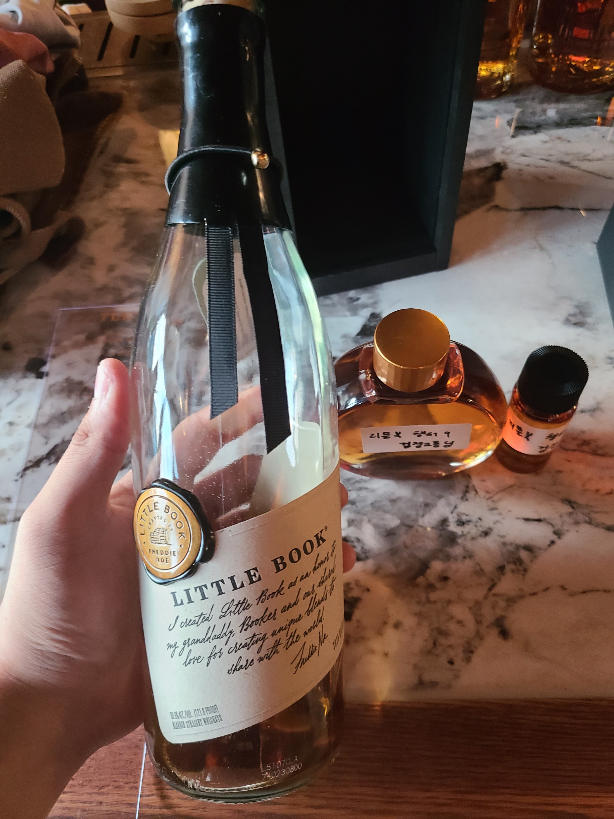 종류 : 블렌디드 위스키 도수 : 121.8 proof N - 과일 사탕, 풍선껌, 복숭아, 구운 사과, 건초, 카라멜, 오크, 건과류, 정향, 체리 너무 신기하게 사탕 혹은 풍선껌 같은 단내가 코를 먼저 찌른다. 복숭아스러운 과일의 향과 구운 사과의 스모키한 달달함. 라이의 비율은 확실히 낮아진 것 같고 건초의 뉘앙스도 함께 느껴진다. 찐한 카라멜과 오크의 향. 건과류의 고소한 향까지 빵 같기도 하면서 빵이 아닌것도 같으면서 어렵다. 정향의 스파이시함과 아세톤도 살짝 올라오고 정말 끝에가서 체리가 느껴진다. 갓 오픈해서 그런지 약간의 거친 느낌은 있지만 밸런스 좋고 꽤 맛있는 향들이다. P - 카라멜, 흑설탕, 바닐라, 버터, 쿠키, 라이, 건초, 허브, 초콜릿, 체리, 시트러스, 땅콩, 오크, 베리, 건과류, 헤이즐넛, 시나몬, 정향 응? 왜 이리 부드럽지. 도수에 비해 임팩트가 살짝은 약하다. 그렇다고 맛이 약하지는 않다. 흑설탕과 카라멜의 단 맛과 강하게 느껴지는 바닐라. 그리고 버터를 싸악 바른 쿠키! 단 맛과 고소한 느낌이 지나가고 느껴지는 라이의 뉘앙스. 블렌디드라 그런지 확실히 맛들이 복합적이고 레이어도 풍성하다. 밀크초콜릿, 체리, 시트러스, 땅콩, 오크, 베리, 건과류, 풀, 허브, 시나몬 등. 마시면 마실 수록 계속 새로운 맛이 느껴진다. 맛들이 너무 부드럽고 노트 하나 하나가 너무 취향이다. 정말 데일리로 쌓아두고 마시고 싶다. N - 초콜릿, 오크, 카라멜, 오크, 향신료, 구운 건과류 앞에 마셨던 챕터 8에 비해서는 다소 아쉬운 부분이 없는 것은 아니다. 임팩트적인 부분이나 향의 복잡성, 풍미 등 몇가지 요소에서 어느정도 아쉽다. 하지만 그럼에도 꽤나 맛있다. 노트 하나 하나가 내 취향에 맞고 전체적인 캐릭터도 너무 좋다.