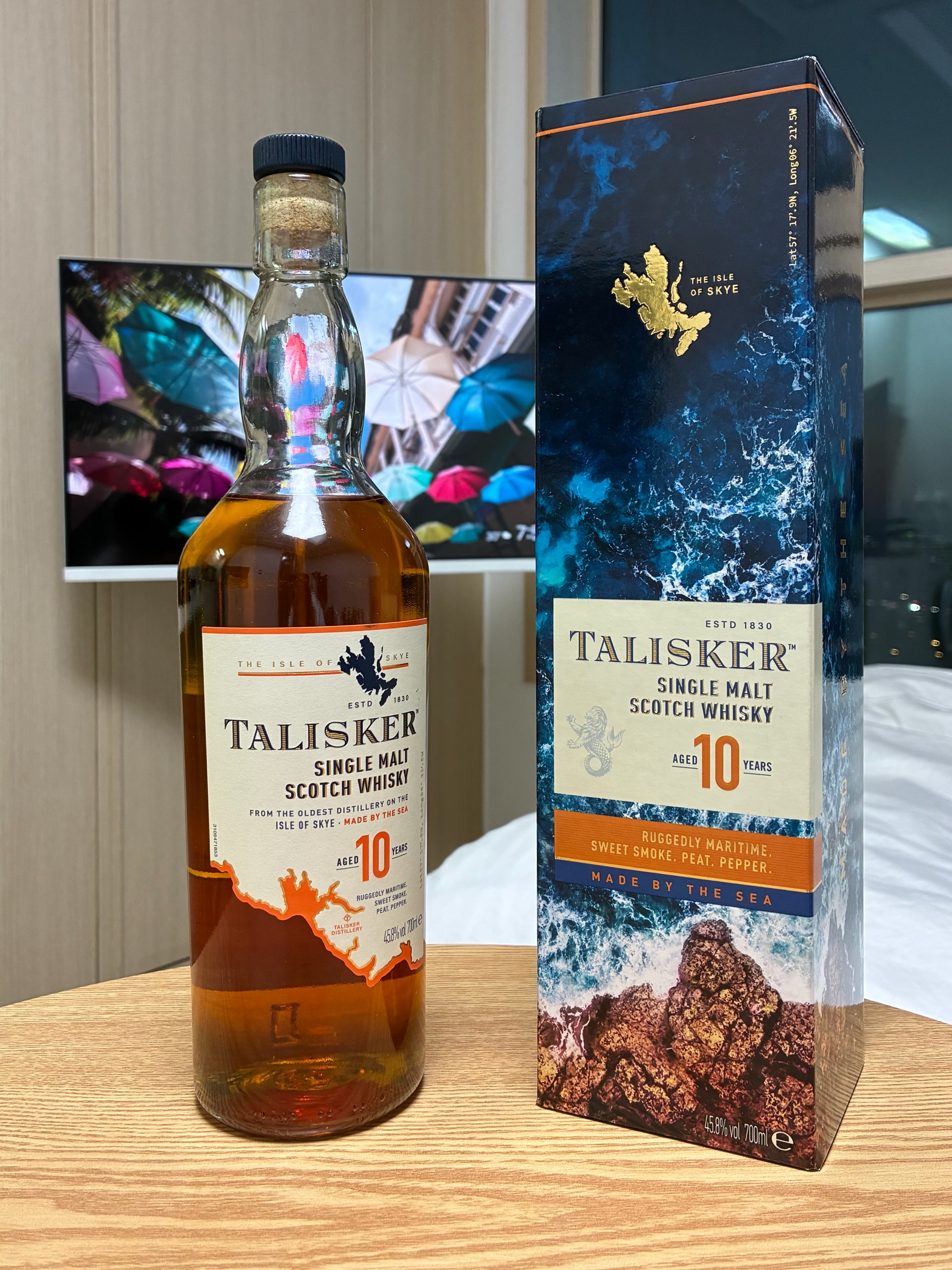 - 요약: 싱글몰트, 스카치, 스카이섬, 피트계열. 북서쪽의 작은 섬 skye에서 생산. (스카이 섬 유일한 증류소) 피트 처리한 몰트를 사용, 바다 인근 숙성. alc 45.8% - N: 요오드, 훈연향. 볏짚 냄새. 약간의 파인애플 단내. 특정할 수 없는 쌉쌀한 냄새와 약한 오크향 등. - P:의외의 달큰함(청과실쪽), 짠맛, 씁쓸함. - F: 은은한 정로환 향. 적은 편의 스파이스. 스모키한 텁텁함 등. 피니시 자체는 짧은 편. - 총평: 바에서 보모어12 먹어보고 잔을 깰 뻔한 경험이 있는데, 탈리스커는 그에 비해 피트함도 덜하고 좀 더 복합적인 달큰한 맛이 있어서 입문 난이도가 낮은 듯. 피트의 매력을 느껴보기에 아주 좋은 선택지인 것 같음. 여타 스카치에 비해 개성이 뚜렷한 보틀이라 이따금 생각날 만하다.