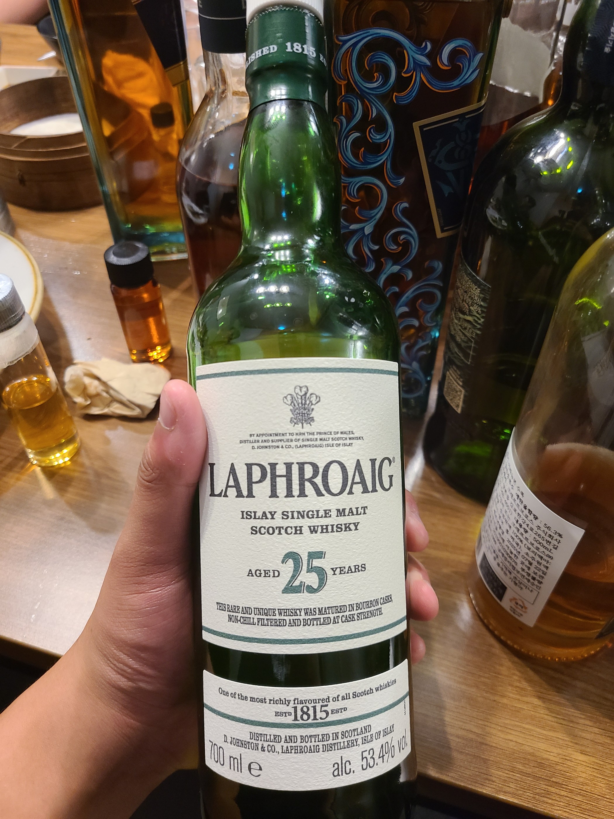 종류 : 싱글몰트 위스키 도수 : 53.4% 컨디션 : 뚜따 N - 피트(스모크, 요오디, 짠내), 머스크, 청사과, 청귤, 유채꽃, 오일리, 빵, 바닐라 잔잔하게 깔려있는 피트 향. 라프로익의 캐릭터가 엄청 절제되어있다. 고소한 피트 향, 스모키, 짠내가 있으면서 순간 해산물 msg가 생각났다. 머스크와 청사과 같이 시원하면서 단내나는 과일의 특징이 있다. 약간의 민티함 사이에 꽃도 보이고 부드러운 시트러스도 함께 있다. 청귤이 생각나는 약간은 쌉싸름 하면서 톡 터지는 산미감이다. 오일리함도 있으면서 계속 맡고 있으면 빵 같이 고소한 향이 조금씩 강해진다. 라프로익의 개성적인 향을 고숙성이라는 힘과 버번캐스크가 잘 눌렀다. 시원한 느낌이 상당히 좋으면서 함께 노즈에 올라오는 고소한 향이 정말 매력적이다. P - 건과류, 오렌지, 자몽, 바닐라, 꿀, 케이크, 짠내, 스모키, 사과, 레몬, 후추, 몰트 첫 입에서 건과류 믹스를 한번에 씹은 것 같은 고소함과 과일의 산미감이 강하게 느껴진다. 버번캐임을 알기에 베리보다는 오렌지와 자몽 같은 과일이 생각났다. 피트의 뉘앙스도 향에서 처럼 상당히 잔잔히 깔려있으면서 노트들을 하나씩 끌어 올려주는 것 같다. 처음에는 고소함과 산미, 다음에는 단 맛, 짠 맛 다시 한번 산미, 스모키, 다시 피트로 마무리된다. 단 맛도 처음에는 선명한 꿀이라고 생각했는데, 점차 케이크 같은 생각이든다. 바닐라의 노트도 보여서 합쳐진 것 같다. 바닷가가 생각나는 짠맛이 지나가고 향에서 msg라 생각해서 그런지 멸치,,, 같은 생각이든다. 오일리함이 함께 있으면서 입안에 짠 맛을 움직인다. 도수에 비해 상당히 부드럽고 과일의 노트가 정말 선명하다. 적당히 생각난 과일이 오렌지, 자몽, 사과, 레몬 같이 꽤 강한 프루티다. 맛의 레이어가 잘 쌓여있다고 생각한다. F - 땅콩, 스모키, 꽃, 오크, 레몬, msg 스모키한 피니쉬가 길게 남는다. 그리고 조금씩 과일의 노트와 꽃?이 생각나는 잔 향이다.