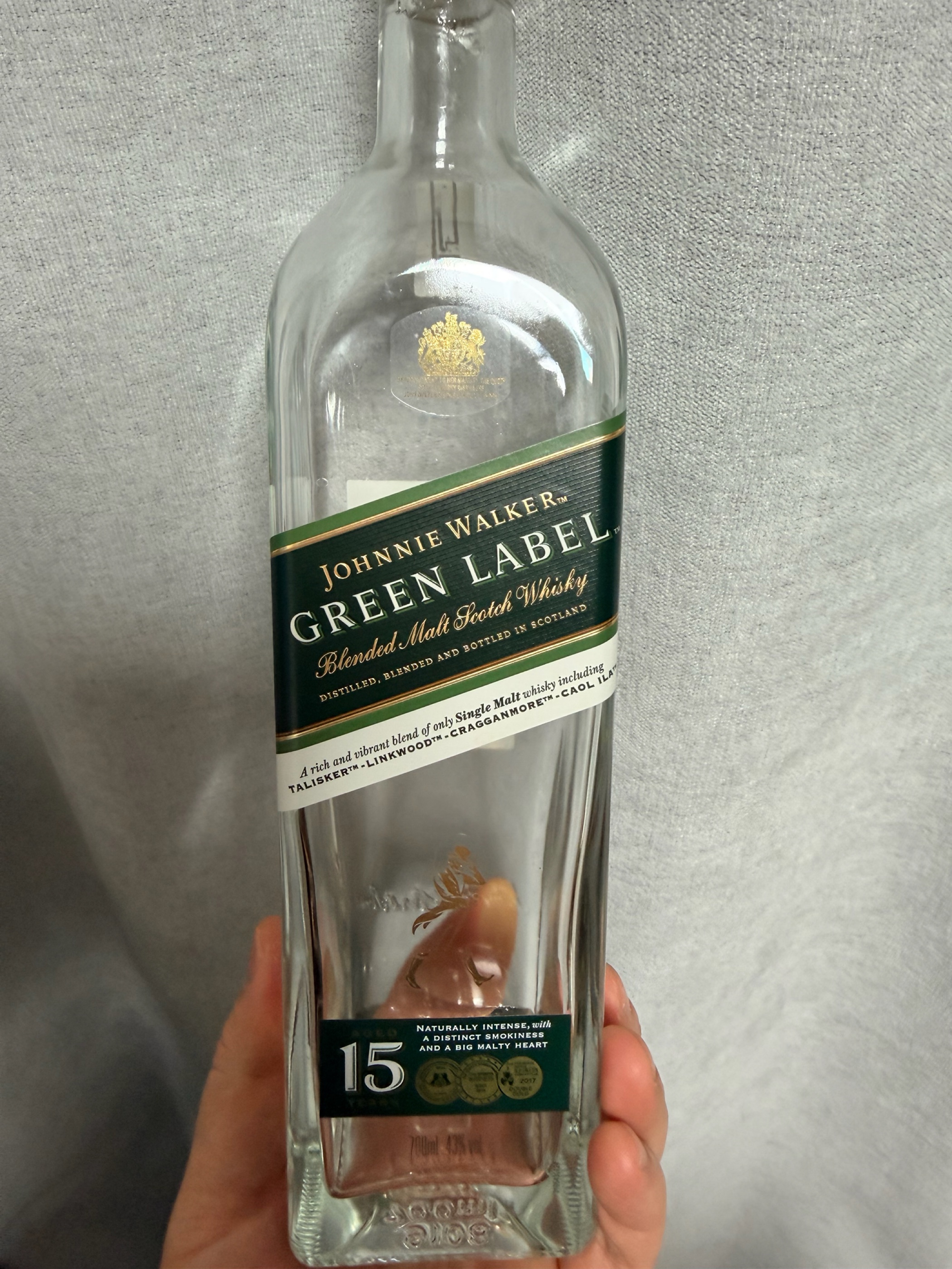 세번째 바틀킬 조니워커 그린입니다. [ 블랜디드 / 700ml / 43% ] 돌고돌아 조니워커라는 말을 알게 해준 조니워커 그린라벨입니다. 병에 대놓고 탈리스커, 쿠일라, 링크우드, 크라겐모어 키몰트라고 써 있네요 사실 저는 발렌타인의 몰트 강하고 스모키보다 조니워커의 조화로움과 피트감 잔내가 좋더라구요 블랙, 그린, 블루 중 단연 가장 맛도리는 블루이지만 가격이 20만원 후반이라 선택의 폭이 많아지죠 하지만 그린의 7만원대 선택에선 이놈이 왠만한 싱글몰트도 다 잡아버립니다. 데일리 최강자가 아닐까 싶어요 혹여는 블루보다 더 맛있다(?)는 분들도 많아요 달콤함과 짭조름함과 마지막의 사짝 올라오는 약피트의 밸런스를 경험해보세요! 재구매율 100%입니다. 믿고 드세요